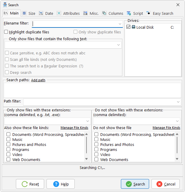 The Expert Search Window provides many more search options available via the tabbed interface:
