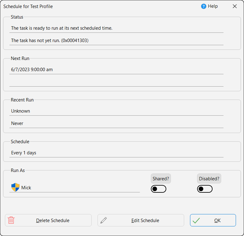 A summary of the Schedule will be displayed for your review. If everything is correct, click on OK to close the window. Then click OK again to close the profile setup window in the background.