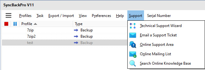 •With SyncBackPro you can have it create a Support Zip file on your desktop containing the profile, its log files, and other information via Support -> Technical Support Wizard in the main window. You can then attach that Support Zip file to the support ticket. See the section below for details.
