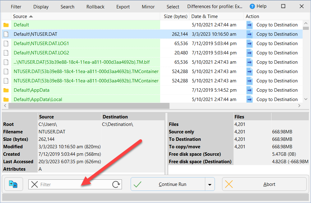 After you have reviewed the differences, made whatever changes are required (if any), and are ready to continue with the profile run, you can click either the 'Continue' button or the 'Abort' button. Aborting will stop the profile run immediately and no files will be copied, deleted, or moved.